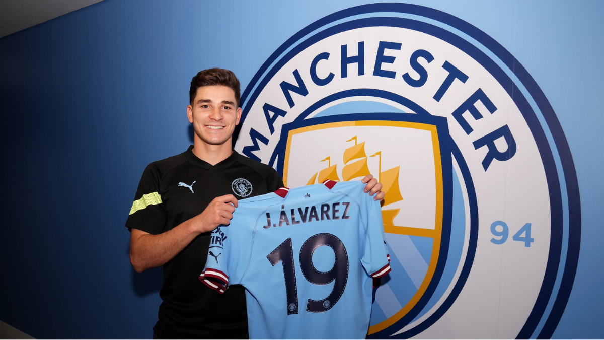 Una imagen que los hinchas de River no querían ver: Julián Álvarez ya es jugador del Manchester City. El club azul realizó un gran evento para presentar a la Araña en el Eithad Stadium.